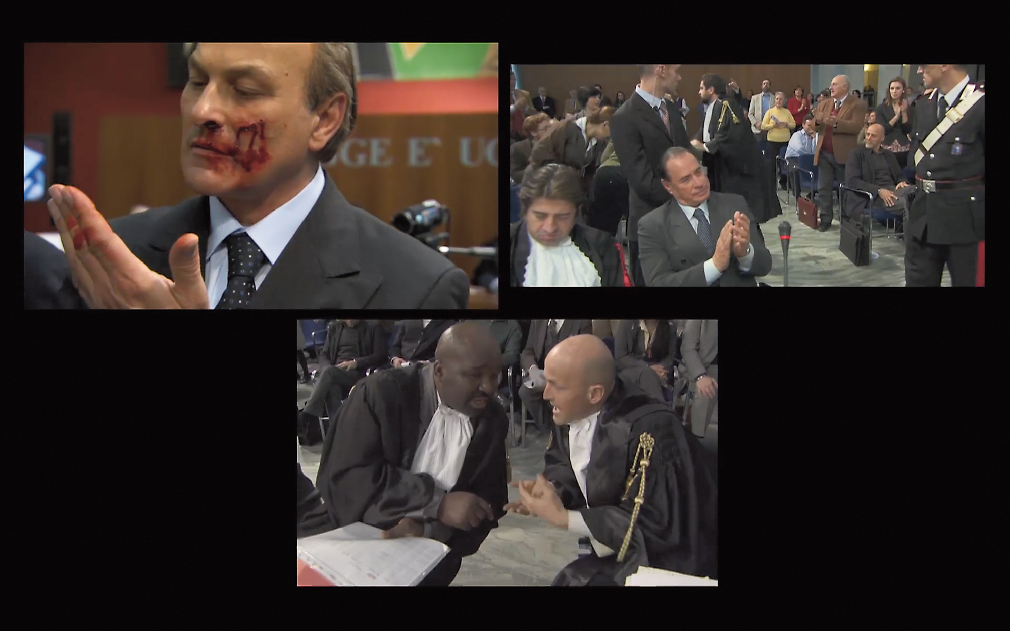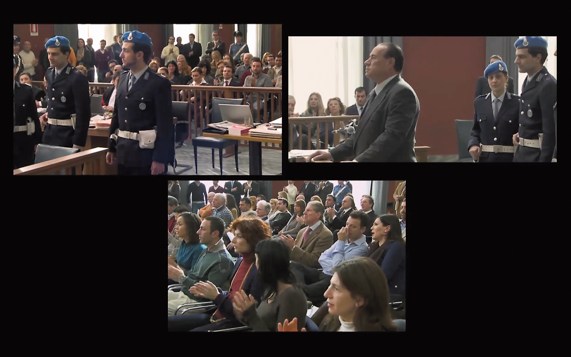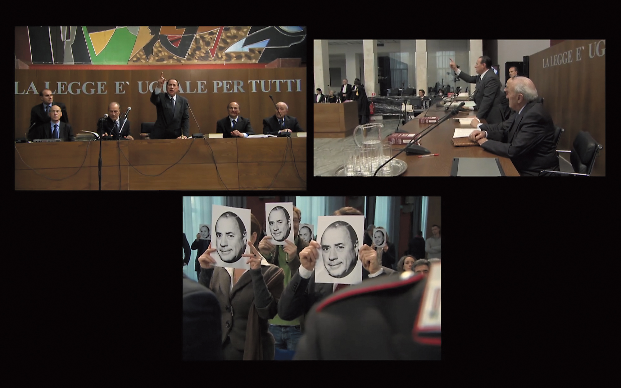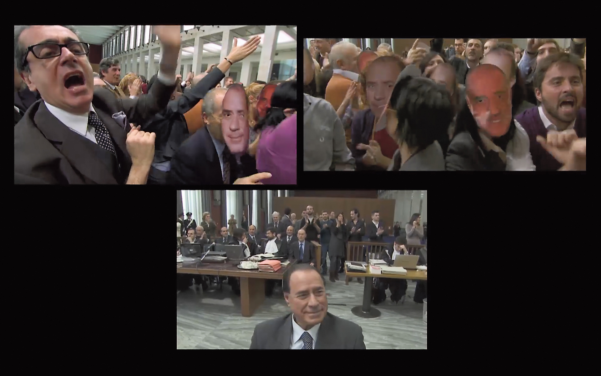 Aernout Mik (1962) is beeldend kunstenaar. Hij had solotentoonstellingen in o.a. het Van Abbemuseum in Eindhoven, het Stedelijk Museum in Amsterdam, het Museum of Modern Art (MoMA) in New York, het Jeu de Paume in Parijs en het Folkwang Museum in Essen. In 2002 ontving hij de Heinekenprijs. Nieuw werk van hem is vanaf 16 januari 2026 te zien in Galerie carlier / gebauer in Berlijn. Shifting Sitting (2011) is gefilmd vanuit drie verschillende camerastandpunten en op evenzoveel schermen ontvouwt zich een statige Romeinse rechtszaal. Rechters, advocaten, politieagenten-bewakers, beschuldigden en toeschouwers bewegen zich steeds meer door elkaar heen, alsof rollen niet langer aan personen toebehoren maar aan protocollen en gedragingen die voortdurend worden afgeschud en opnieuw toegeëigend. De rechtszaal verandert zo in een arena waarin hiërarchieën worden uitgedaagd en botsende standpunten fysiek worden uitgevochten. De figuur van Berlusconi, die terechtstaat voor corruptie (nagespeeld door een acteur), vertegenwoordigt hier niet alleen de politicus, maar ook het fenomeen van een identiteit die opgaat in haar eigen mediabeeld: een personage dat zo vaak is nagespeeld, geciteerd en gekopeerd dat zijn aanwezigheid een vorm van collectieve fictie wordt. In Miks installatie verschijnen steeds meer maskers, onder andere van deze politicus. Zonder geluid – de films van Mik zijn altijd geluidloos – springen de kleinste handelingen in het zicht: een blik, een aarzeling, iemand die van plek wisselt en daardoor ineens iets anders lijkt te vertegenwoordigen. Omdat de drie schermen nooit in één oogopslag te overzien zijn, ontglipt er voortdurend iets aan het zicht. De situatie blijft voortdurend verschuiven en onttrekt zich daardoor aan een eenduidige interpretatie. De kijker raakt gevangen in dezelfde ambiguïteit die het werk zelf blootlegt. Mik toont vaker hoe groepen zich ordenen en hoe die ordening moeiteloos kan ontsporen. Identiteit blijkt geen vaste kern, maar een verzameling gedragingen die als een masker kunnen worden opgezet, afgezet, omgevormd en ontvreemd.